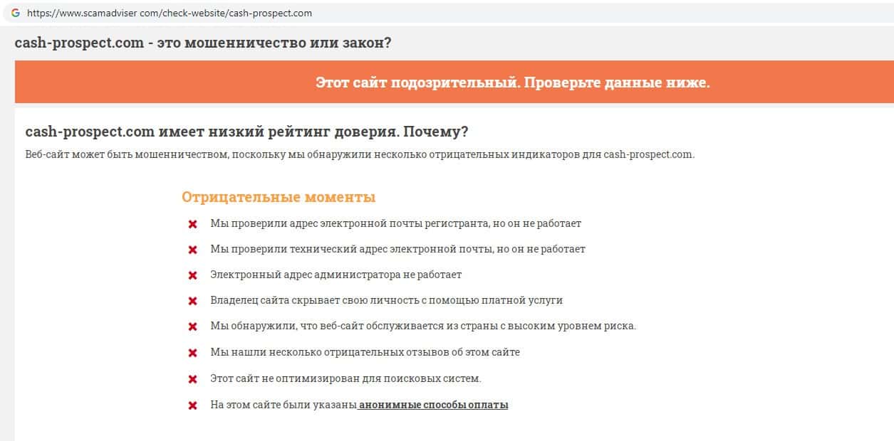 Проверка шараги Кэш Проспект на сайте скамадвайсер ком показала, что у данный сайт подозрительный, а также выявлено множество отрицательных моментов в работе сервера.