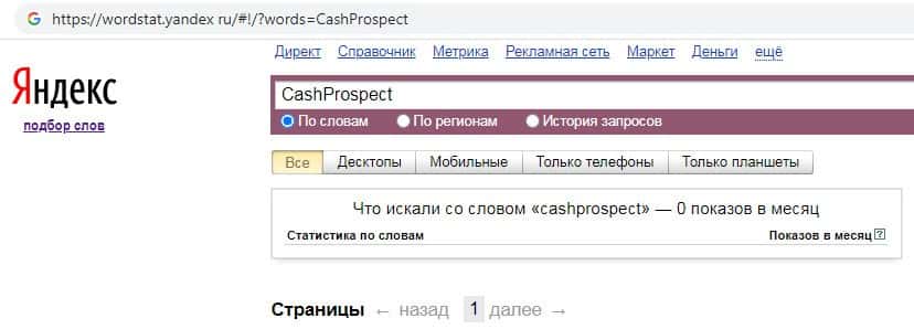 О количестве запросов по бренду названия компании на английском языке без пробела "CashProspect" в поисковике Yandex нет никакой информации.