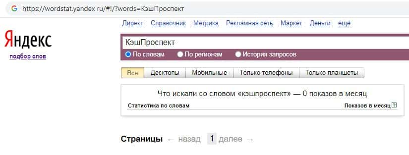 Количество брендовых запросов названия компании на русском языке без пробела "КэшПроспект" на wordstat yandex ru вероятно равно нулю.
