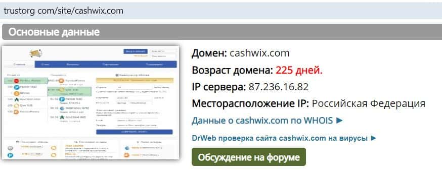 Возраст доменного имени сайта cashwix com составляет 225 дней. Сервис создан относительно недавно, поэтому сильно доверять ему не стоит.