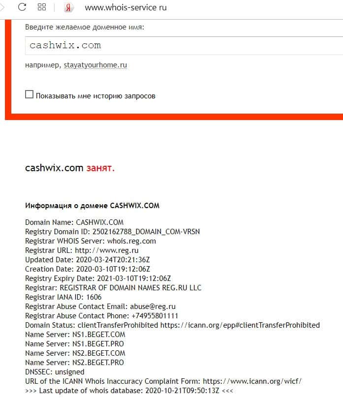 Кому принадлежит доменное имя сайта cashwix com, выяснить не удалось, так как регистрант скрыл свою организацию. Это признак того, что данная компания - лохотрон.