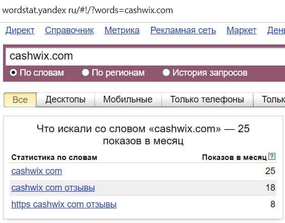 Количество запросов по домену "cashwix.com" с точкой, совершенных пользователями в сервисе Яндекс, равняется 25 показам. Невысокая активность пользователей.