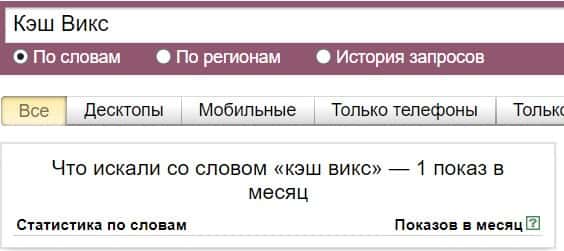 То же название, но написанное с пробелом "Кэш Викс", люди пытались найти в системе Яндекс всего один раз.