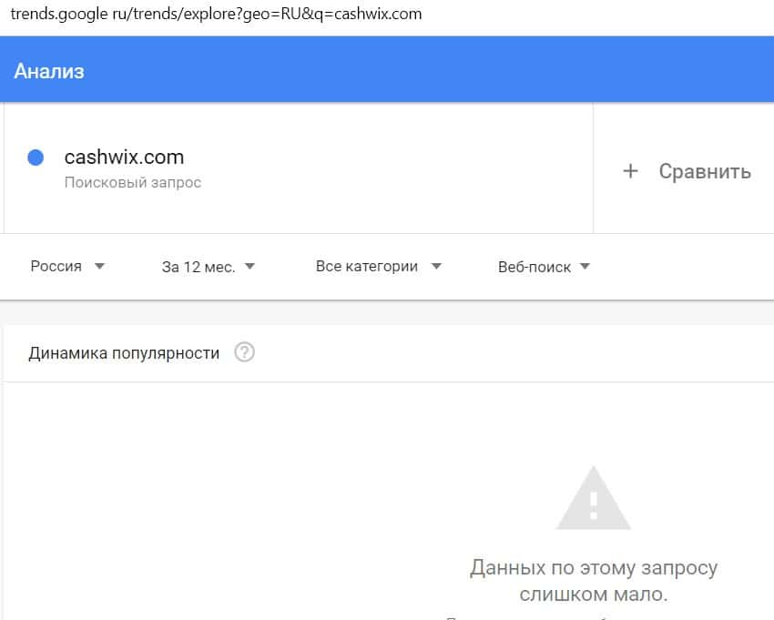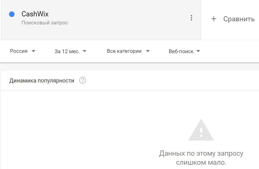 Судя по данным сервиса Гугл Тренд, доменное имя "cashwix.com" с точкой искали в поисковой системе крайне редко.