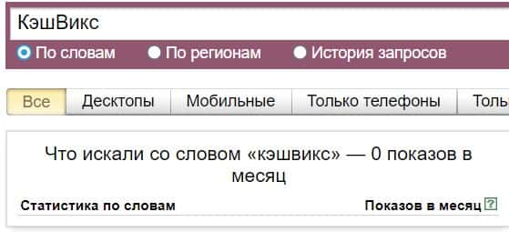 Название бренда "КэшВикс" на русском языке люди не искали в системе Яндекс ни разу.