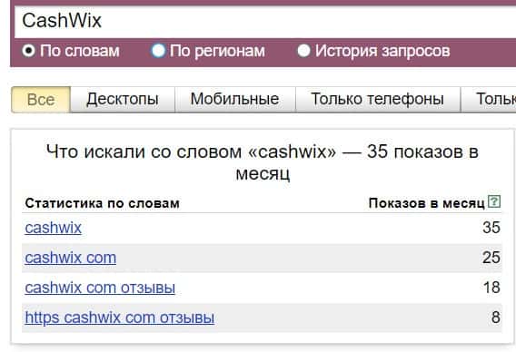 Название бренда "CashWix"на английском языке пользователи пытались найти в системе Яндекс всего 35 раз.