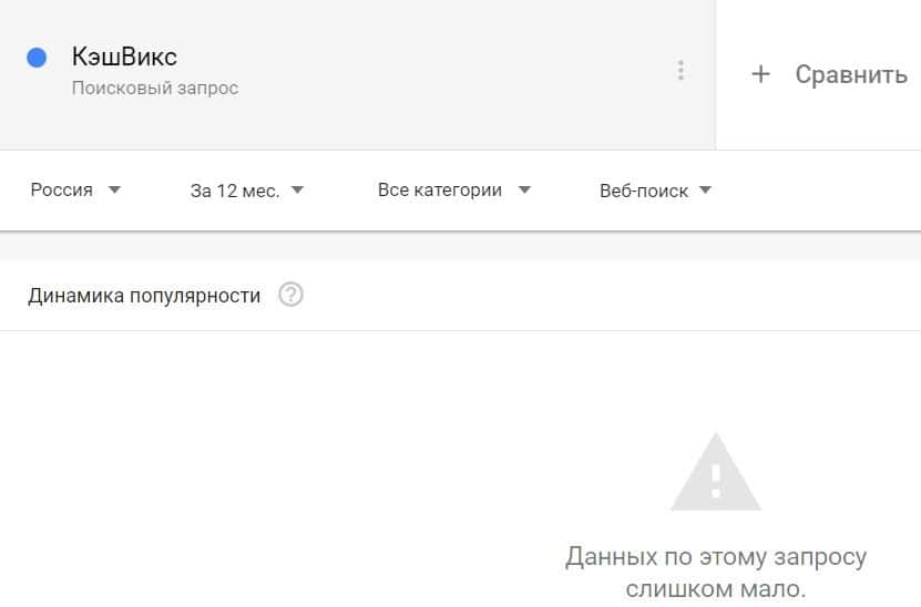 Проверка по названию бренда на английском языке с пробелом "Cash Wix" дала следующий результат: 0 показов - компанию не искали совсем.