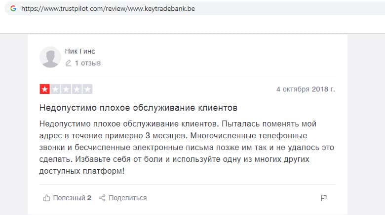 Из данного отзыва мы наглядно видим как сотрудники Кей Трейд Банк относятся к клиентам. Клиент пытался всего навсего поменять адрес, в течение 3 месяцев, это недопустимые сроки для такой простой операции. Не помогли этому действию многочисленные телефонные звонки в банк, и письма на электронную почту.