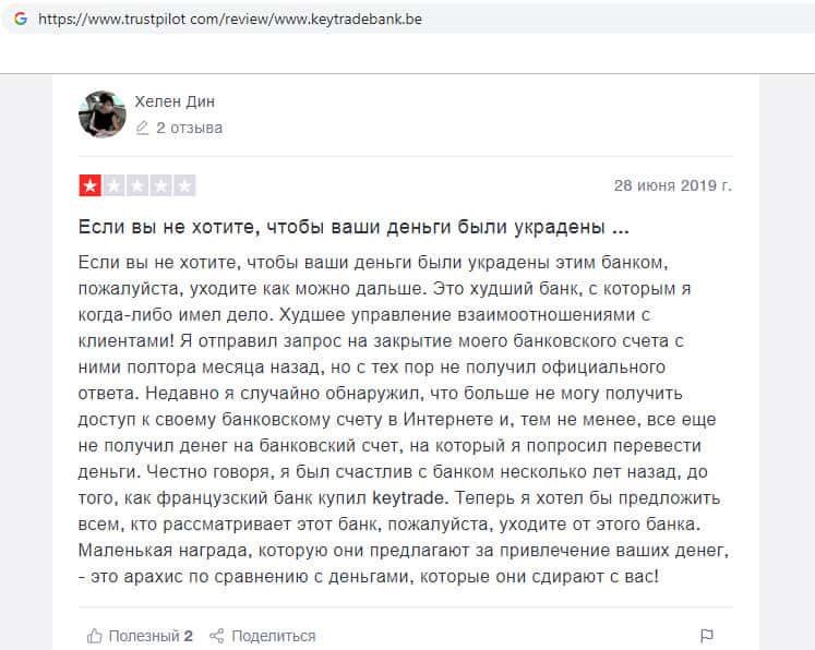Обманутый пользователь Кей Трейд Банком - Хелен Дин всем настойчиво рекомендует не связываться с этим банком, а если быть точнее "уходить как можно дальше" от него. Она стала жертвой аферистов, которые присвоили её счёт, когда она захотела его закрыть. Они просто заблокировали для неё вход, а деньги не перевели на другой, как обещали.