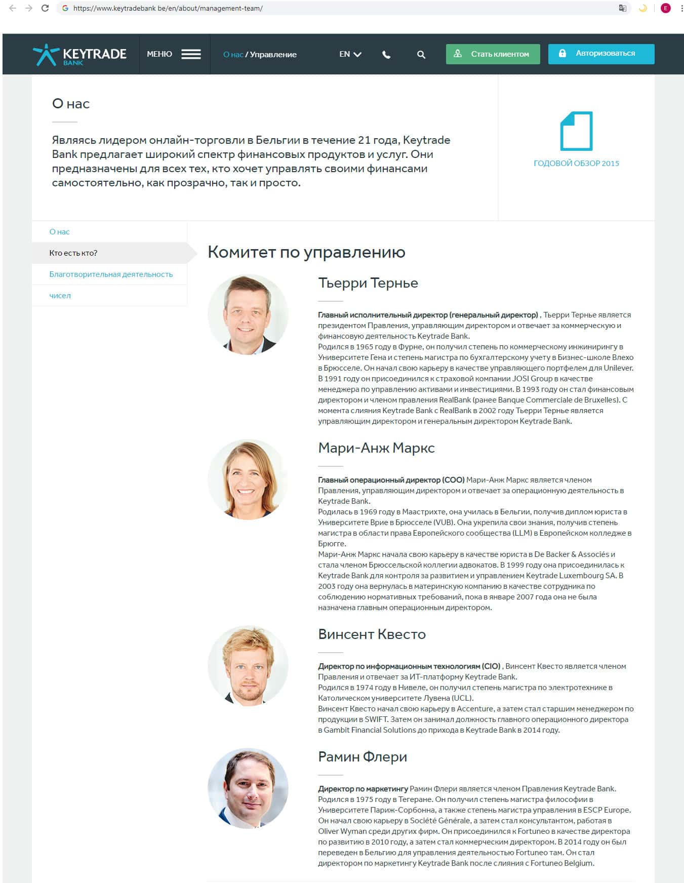 Руководство Кей Трейд Банк не пожелало остаться в тени. На сайте мы можем увидеть тех, по чьей вине люди остаются без денег и банковских счетов. Тьери Тернье - главный исполнительный директор, Мари-Анж Маркс - главный операционный директор, Винсент Квесто - директор информационных технологий, Рамин Флери - Директор по маркетингу.