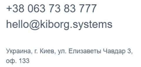 Теперь перейдём к контактной информации. На сайте мошеннической организации Киборг Системс её не то что бы много. Конечно же, на веб-сайте имеется несуществующий юридический адрес, почта и контактный номер телефона, до которого вам вряд ли посчастливится дозвонится. Вот эти контакты: