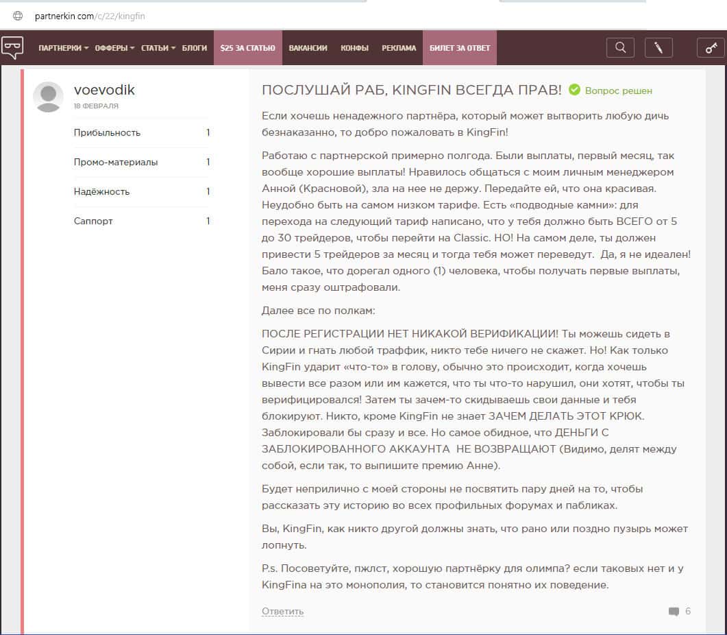 На сайте partnerkin, посвященному форекс брокерам, их анализам и трейдингу на торговых форекс-площадках, присутствует отрицательный отзыв мошеннической конторы KingFin, который был явно написан из-за глупостей автора, которые были сделаны пользователем под ником Воеводик, когда тот начал работу с мошеннической кухней.