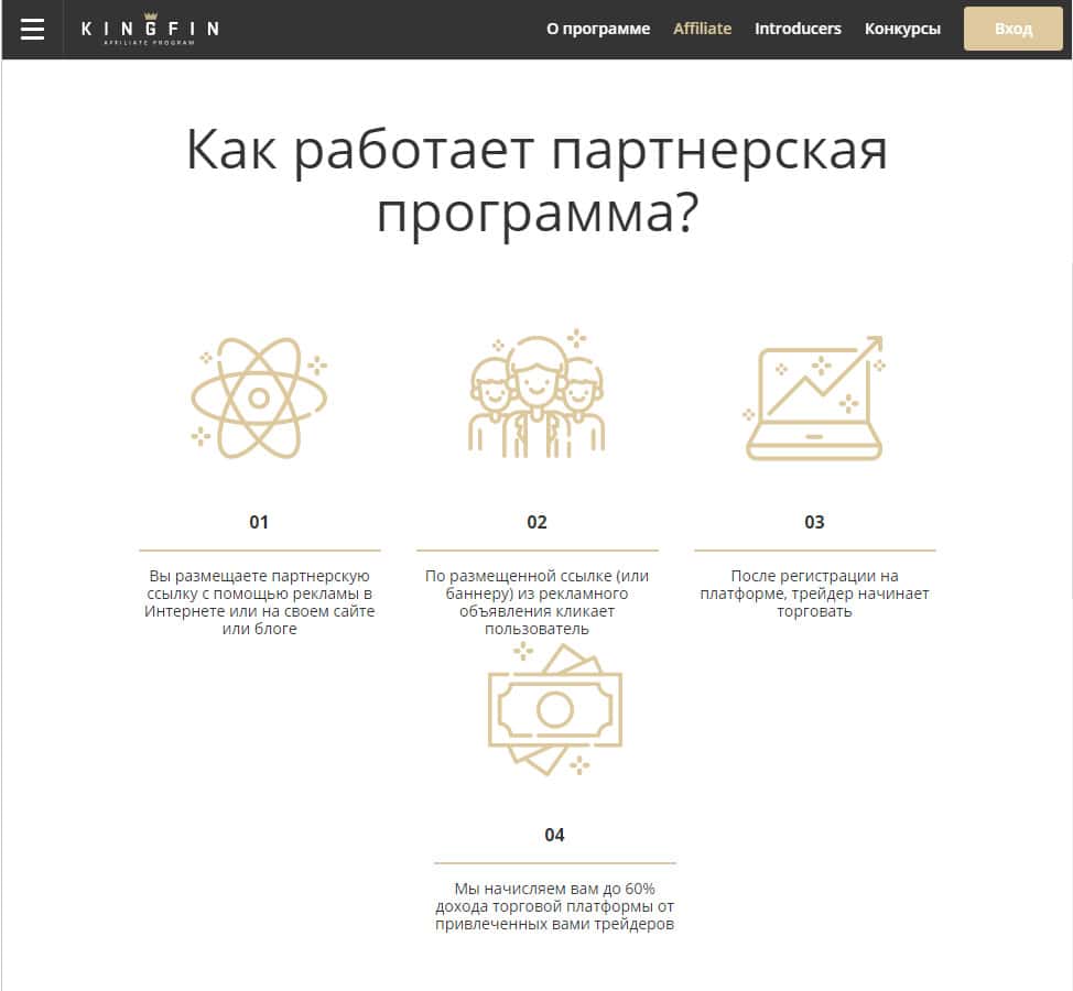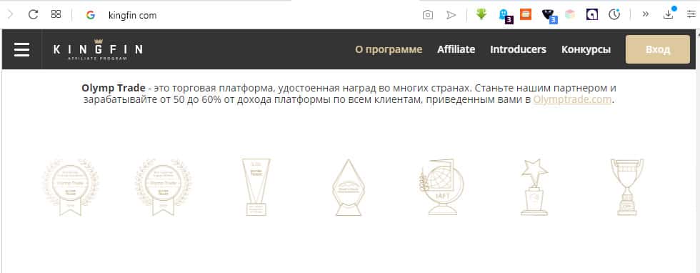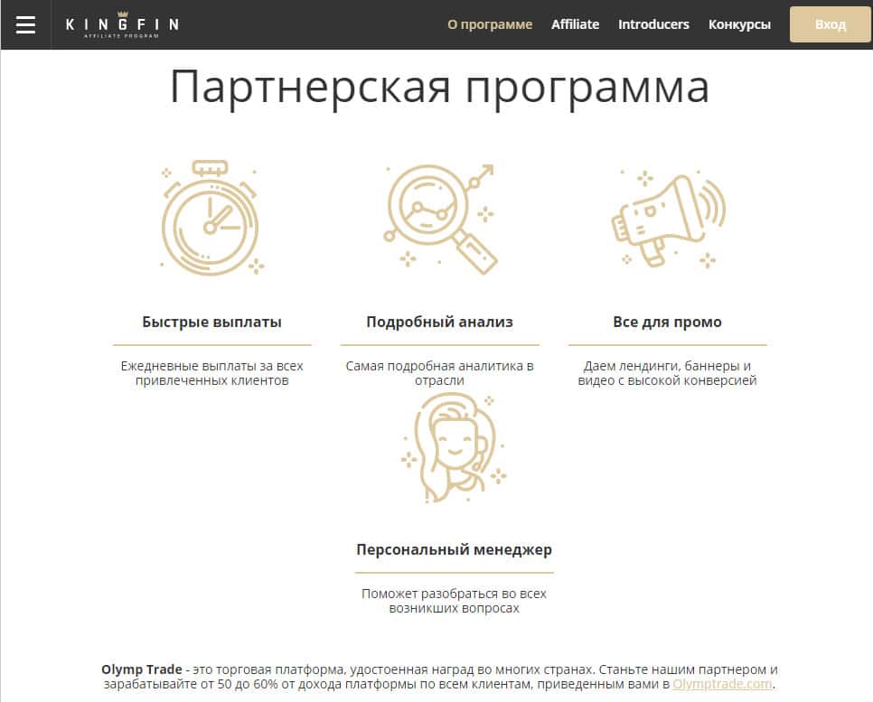 Что же нам предлагает КингФин и в чём её преимущества? Клиентам предлагается попробовать заработать на привлечении трейдеров на торговую площадку Олимп Трейд. Насколько данная площадка является добросовестным брокером рассматривать не будем, оставим это на совести владельцев Олимп Трейд, КингФин и клиентов, сотрудничающих с ними.