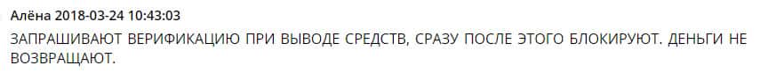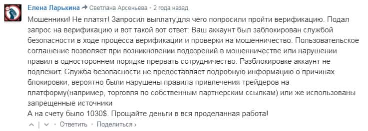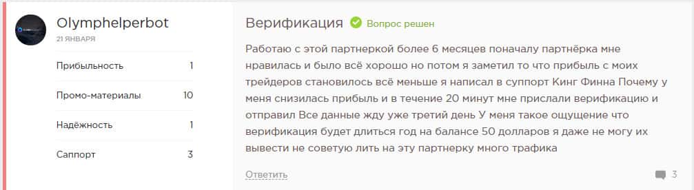 В сети Интернет огромное количество отзывов, подобных размещенному на портале woodytools com пользователем с именем Алёна. Это говорит о том, что ситуация, сложившаяся с Аленой при её попытке заработка с использованием партнерской программы КингФин весьма типична, и является обычным сценарием для мошенников в КингФин а-ля ОлимпТрейд.