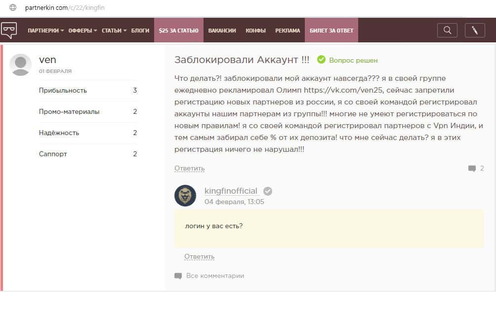 На портале partnerkin пользователь Ven рассказал о своей плачевной истории, как он доверился партнерской программе КингФин мошенничекого брокера ОлимпТрейд, поведясь на разговоры о сверхвысоких доходах при минимальной физической и умственной работе, и решил поработать с этой мошеннической кухней, за что вскоре поплатился своими деньгами.
