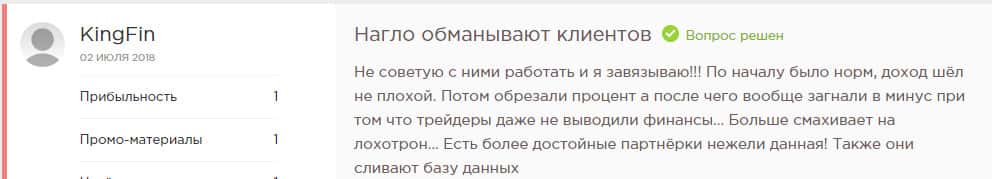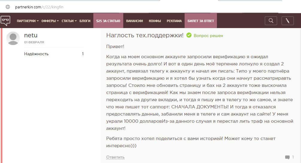 На том же сайте-форуме partnerkin, посвященному форекс брокерам, их анализам и трейдингу на последних, присутствует отрицательный отзыв мошеннической конторы KingFin, который был явно написан от злости на этих псевдо-трейдеров, где говорится о полной безопасности тех, кто не решился на работу с ними и надежности.