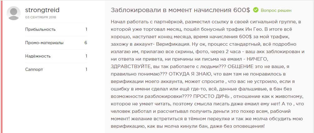 Портал pro-babki ru разместил на своем сайте статью автора под ником MoneyFlow. Он рассказывает историю своего сотрудничества с КингФин. Он предостерегает всех желающих подзаработать на партнерской программе КингФин и рекомендует внимательно изучать соглашение, и то не факт, что выполняя все требования компании, вас не забанит служба безопасности.
