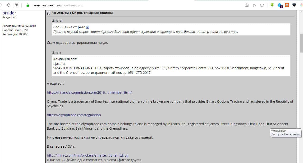 На форуме searchengines guru, посвященному партнерской программе КингФин пользователь bruder полностью разоблачает мошенников и аферистов, имеющих непонятные регистрации своих компаний, путающихся в их названиях, в странах их регистрации, но умеющих обманным путем ободрать клиента, подсчитать и изъять чужие деньги.