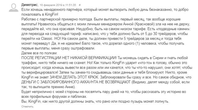 На портале actualtraffic ru пользователь Диметрис поведал полную грусти историю своего сотрудничества с КингФин. Первое время шли выплаты, пользователь был доволен, но когда у него добавилось количество трейдеров и он рассчитывал перейти на следующий тариф, его аккаунт был блокирован, как и денежки им заработанные.