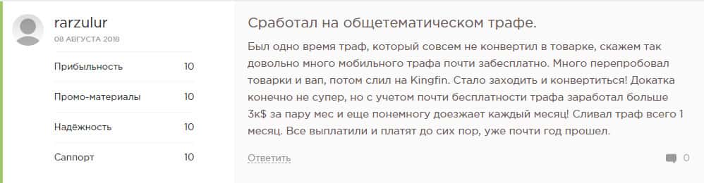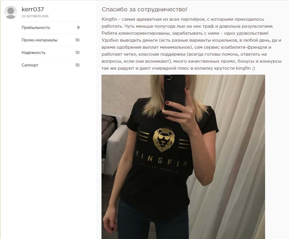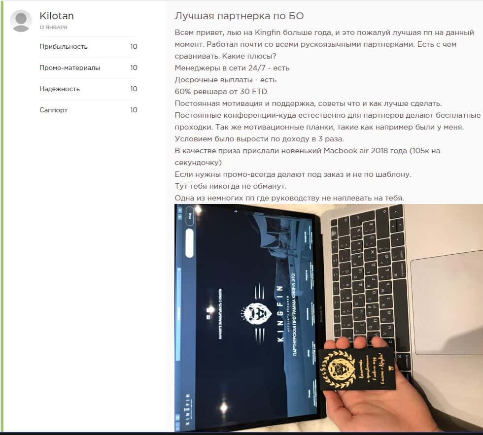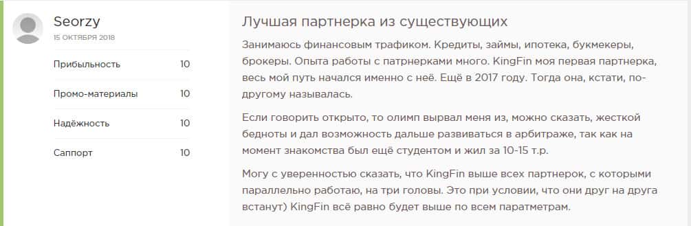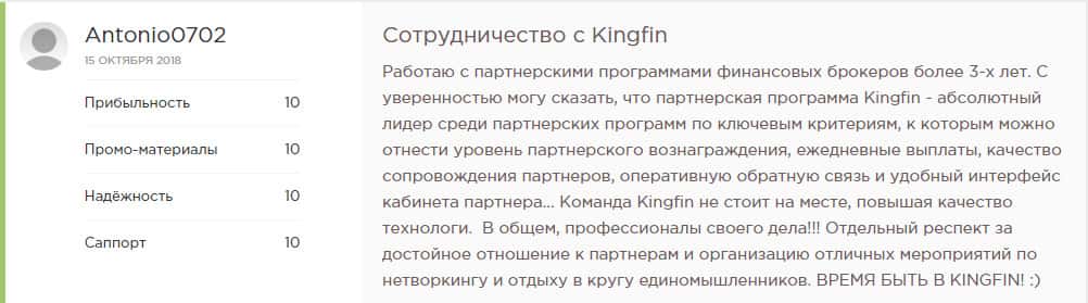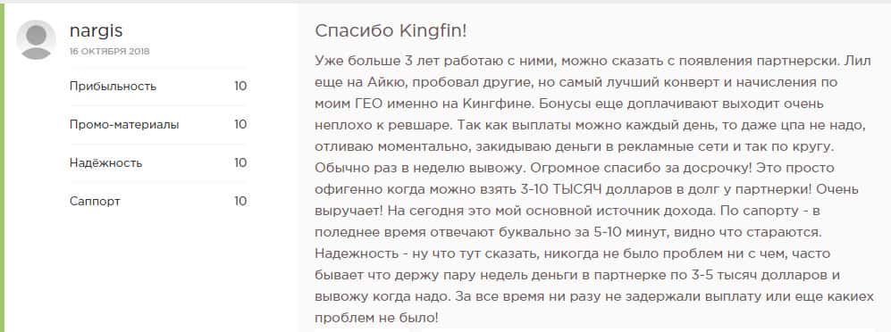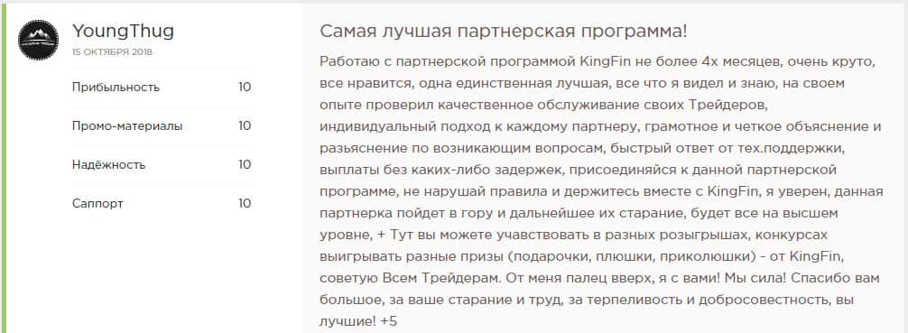 По мнению пользователя КингФин является самой лучшей партнерской программой на рынке. Он со своим партнером сотрудничает с КингФин уже более трёх лет. Всё у них идёт гладко и прибыльно, одна незадача - такое сотрудничество опровергается множеством свидетельств пользователе этой конторы.