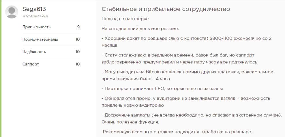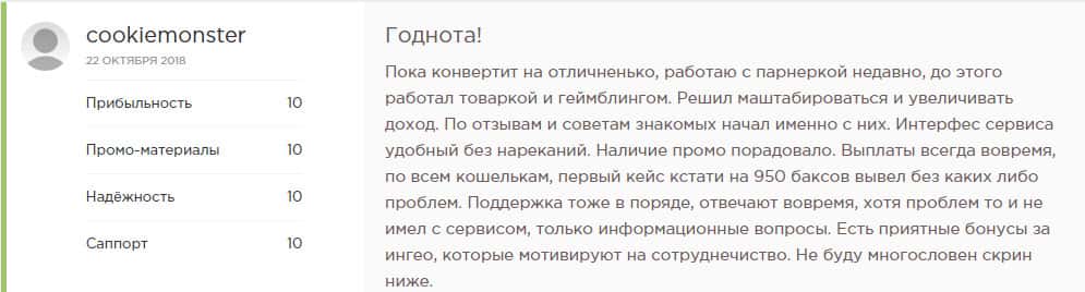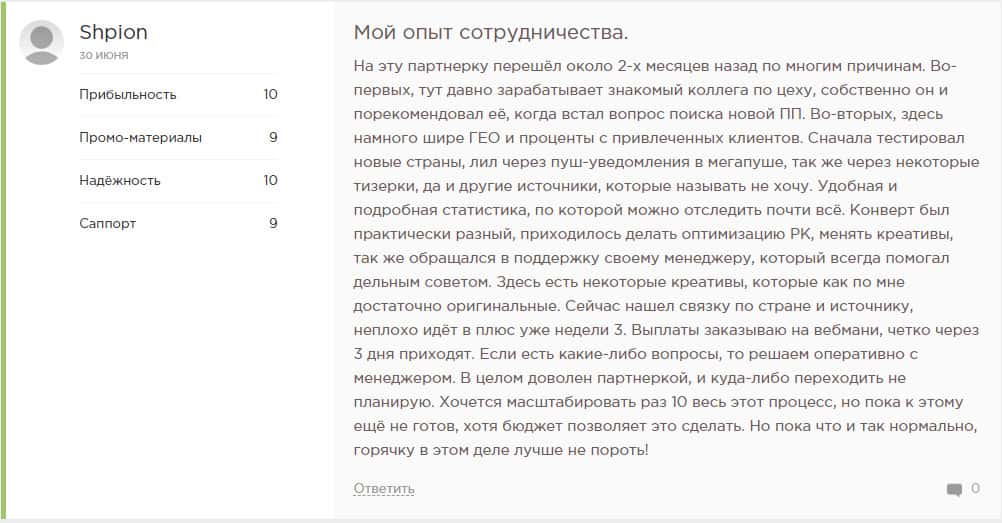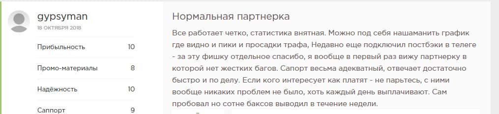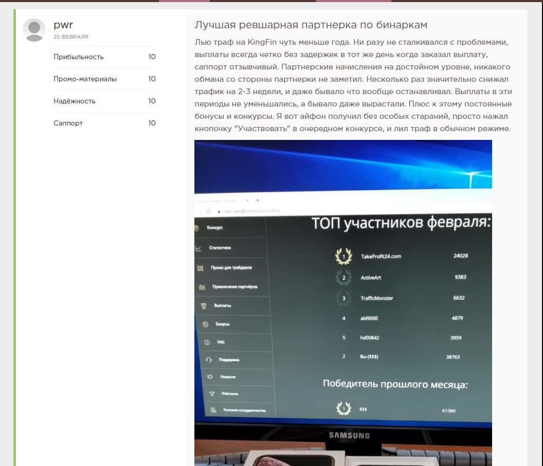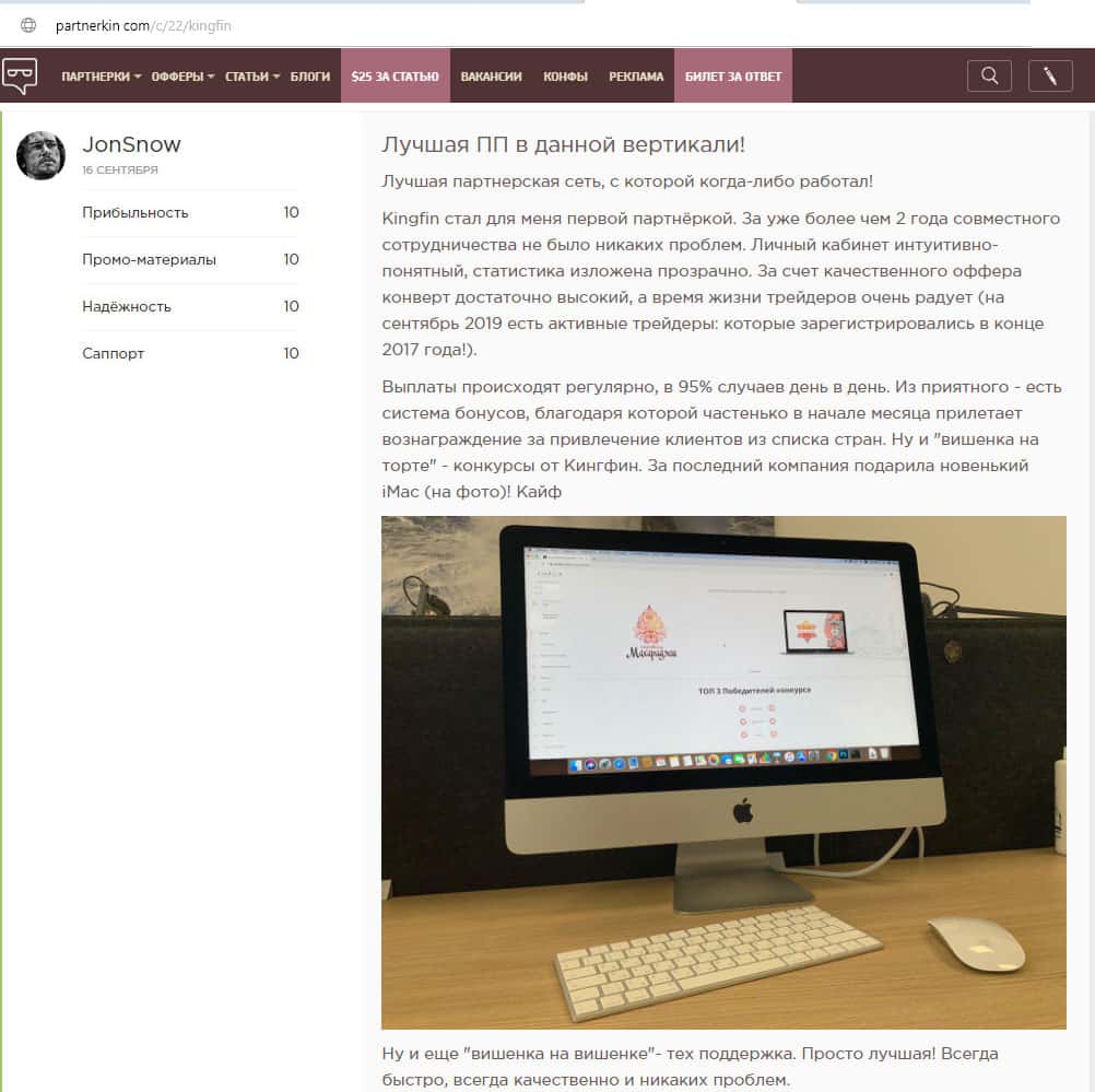 По мнению пользователя КингФин является самой лучшей партнерской программой на рынке. Он со своим партнером сотрудничает с КингФин уже более трёх лет. Всё у них идёт гладко и прибыльно, одна незадача - такое сотрудничество опровергается множеством свидетельств пользователе этой конторы.
