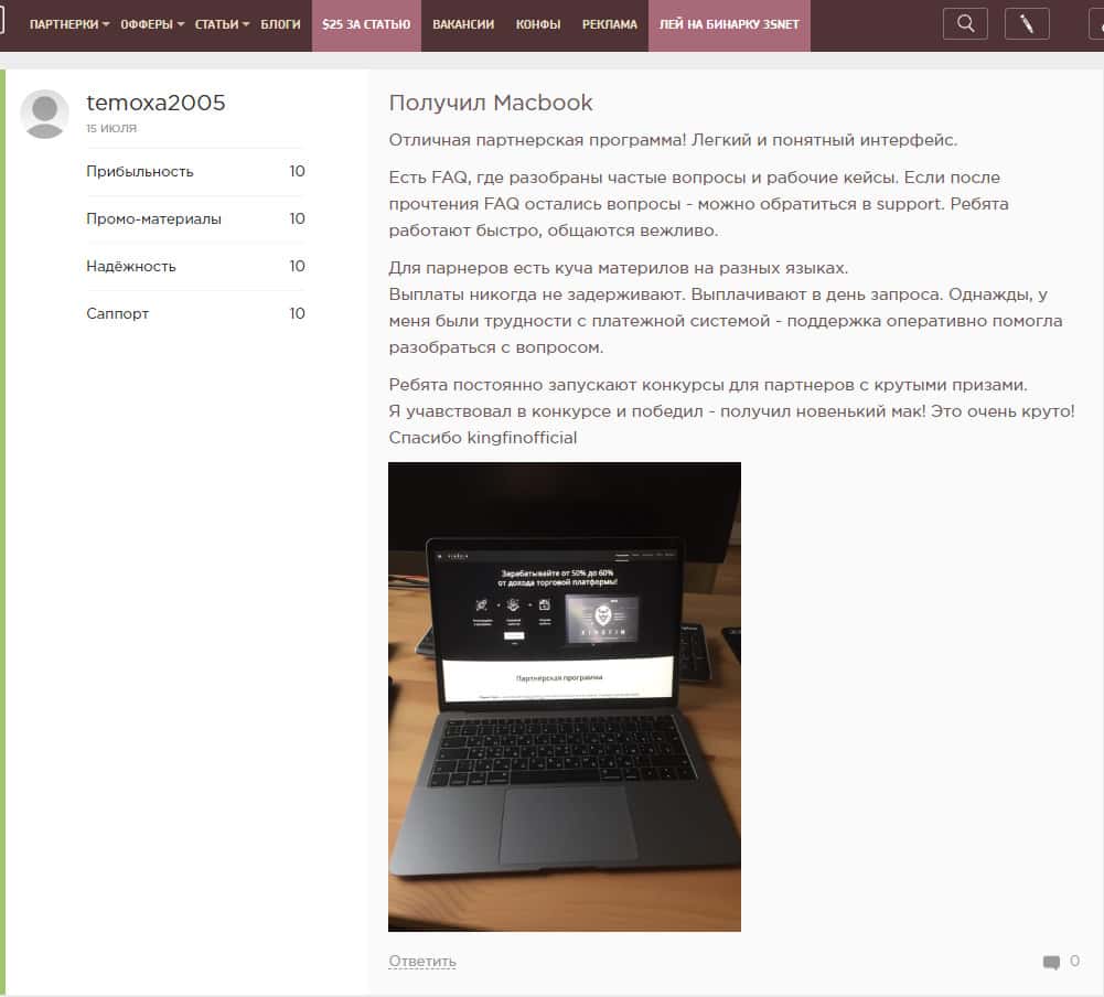 Ещё один, так называемый, "партнёр" мошенников КингФин голосящий о баснословных выгодах и преимуществах партнерской программы жульнической конторы КингФин. Привлекая доверчивых пользователей в ряды клиентов мошенников, он так прославился, что последние подарили ему новенький iMac за его усердие в поисках новых лохов.