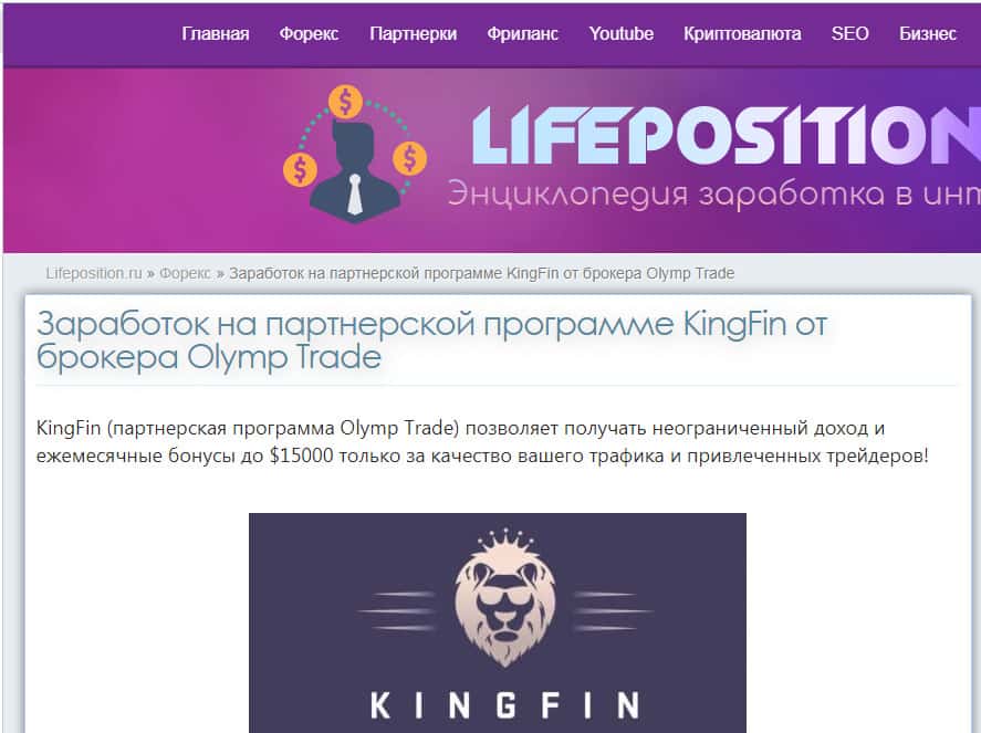 Не отстает и портал lifeposition ru, продолжающий рекламную компанию партнерской программы КингФин, обогащающей своих владельцев и брокера ОлимпТрейд. По данным статьи компания КингФин проводит политику ежемесячных бонусов в пятнадцать тысяч долларов, чем и привлекает новых клиентов.