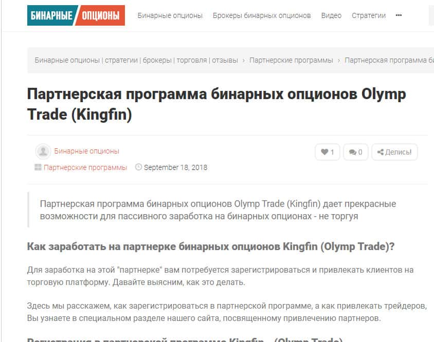 Побуждение к сотрудничеству с партнерской программой КингФин брокера ОлимпТрейд расположено и на портале binarnie-opciony ru. По мнению авторов партнерская программа бинарных опционов Olymp Trade (Kingfin) дает прекрасные возможности для пассивного заработка на бинарных опционах - не торгуя, не рискуя собственными денежными средствами.