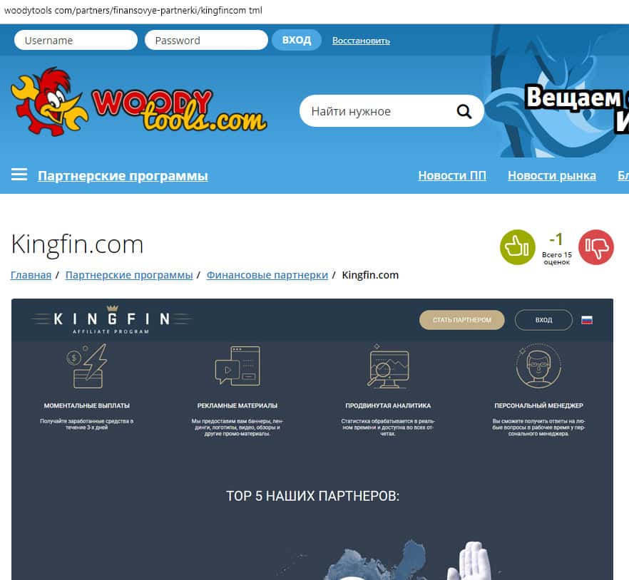 Статья о преимуществах и выгодах использования партнерской программы КингФин, размещенная на портале woodytools com, начинается со слов Начни зарабатывать и закачивается тоже ими. Несмотря на столь агрессивную риторику, рейтинг статьи невысок по модулю, а вообще является отрицательным благодаря реальной ситуации вокруг КингФин.