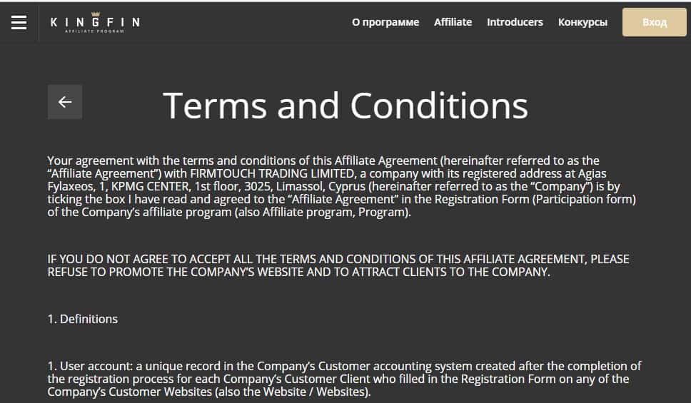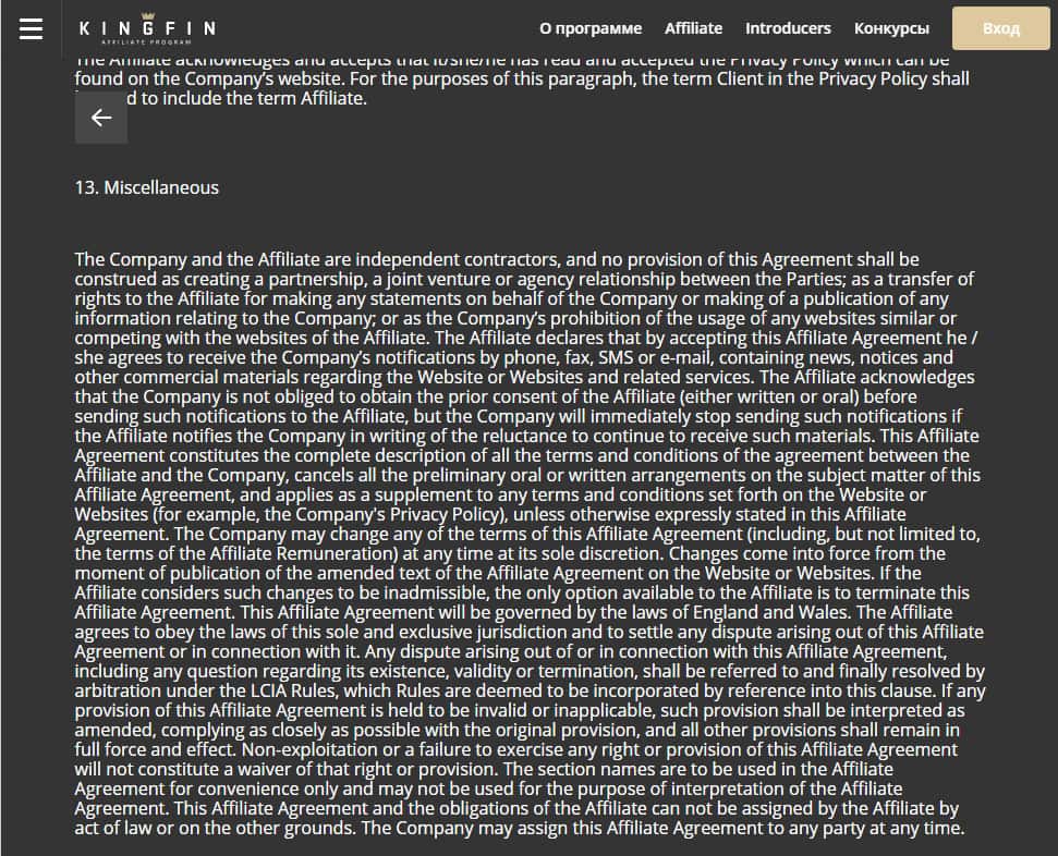 Более-менее реальный обзор партнерской программы, предлагаемой КингФин располагается на портале vsebrokery com. В этом обзоре автор более критично подошел к предлагаемым компанией моделям сотрудничества, их реализации и отличиям. А так же описаны различные условия, выдвигаемые компанией для получения клиентом прибыли.