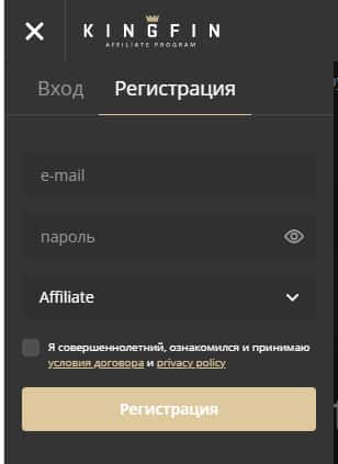 Регистрация в партнерской программе КингФин совсем не сложна: требуется ввести вашу электронную почту, пароль и выбрать партнерскую программу. Также нужно поставить галочку в Вашем совершеннолетии и ознакомлении с условиями соглашения и политикой использования приватных данных. Сложно порой понять, насколько это нужно, прибыльно и небезопасно!