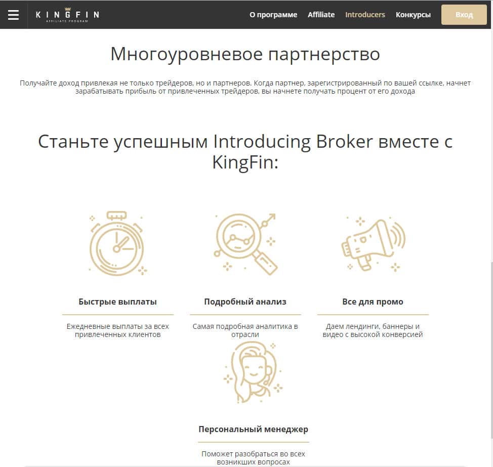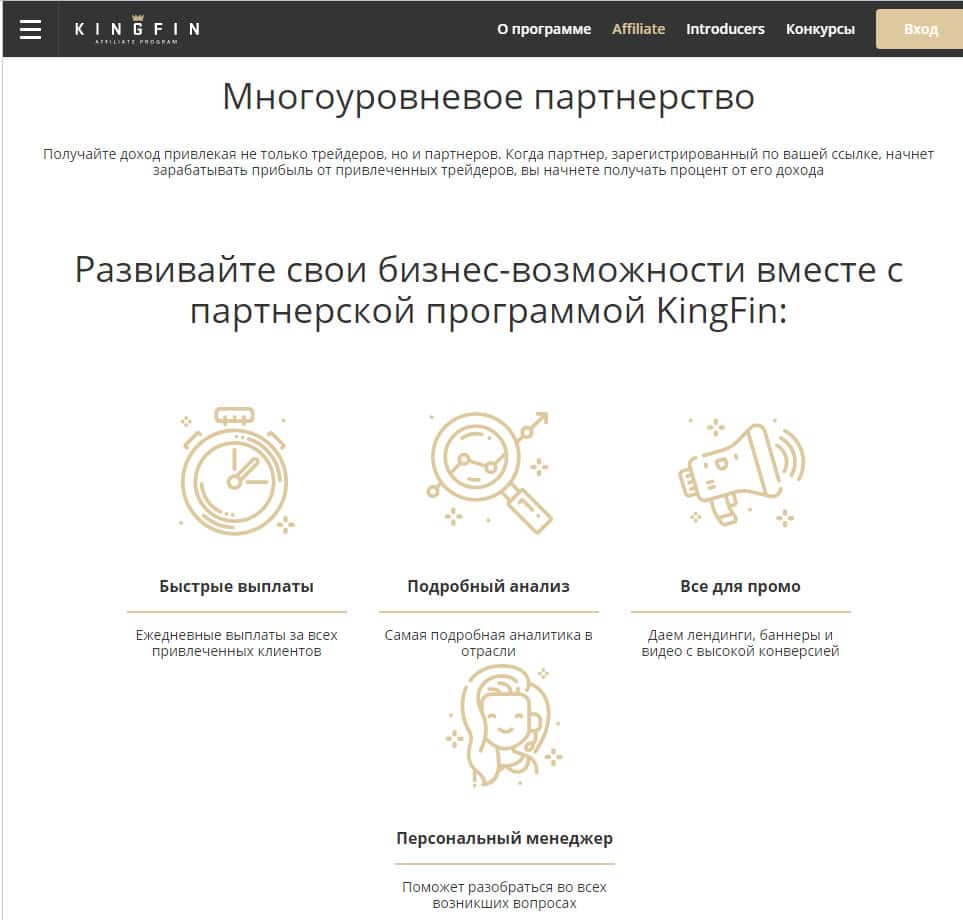 - Ежемесячные бонусы в 15 тысяч долларов на партнёрке КингФин