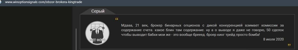 В следующем отзыве пользователь сети призывает, что не следует связываться с конторой Кинг Трейд, так как они снимают левые комиссии и деньги вывести не дают.