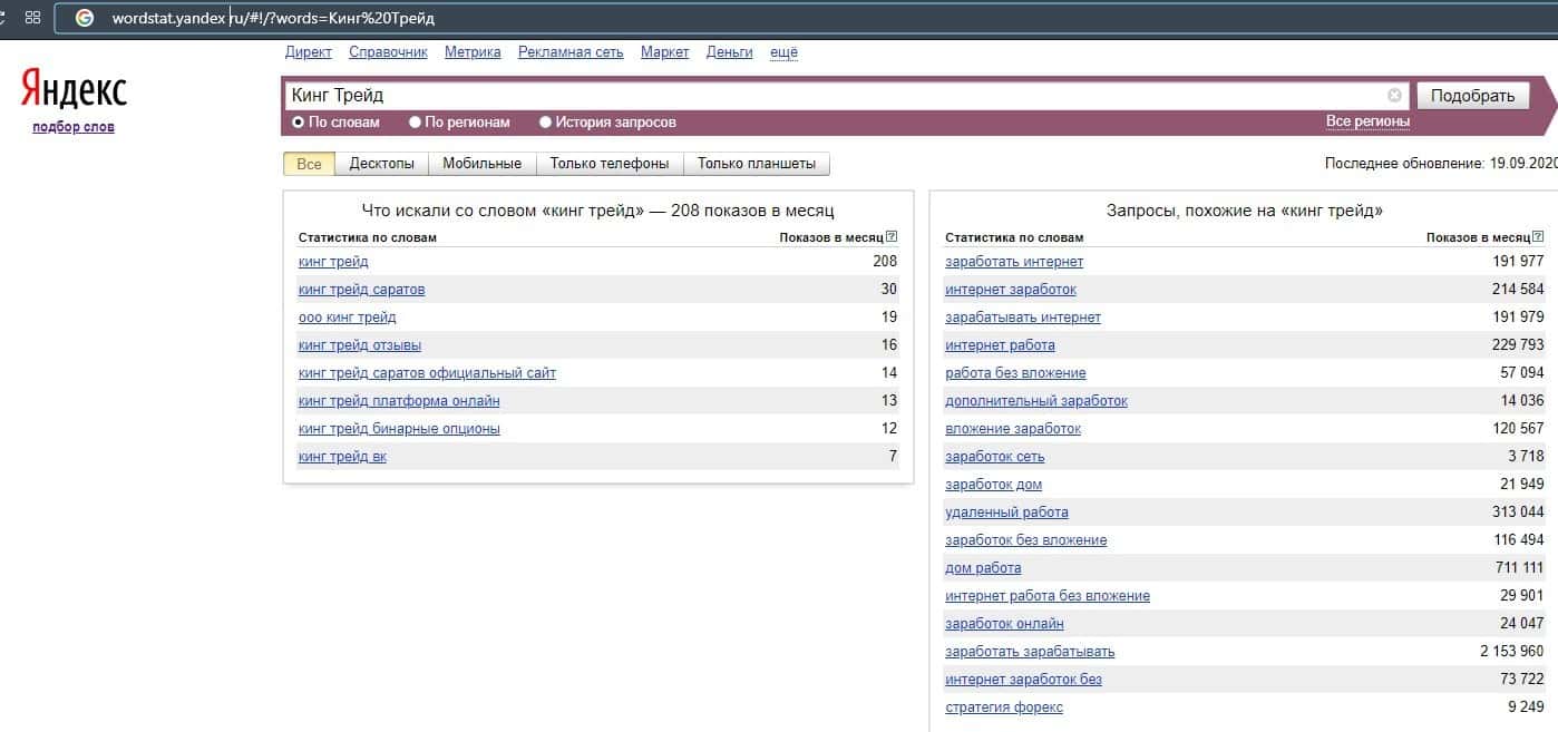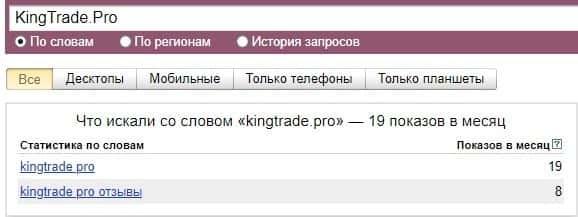 Немного ситуация поменялась, если вместо самого названия лохотрона ввести сайт без точки в домене "KingTrade Pro". Показатели достигли значения 19 показов за месяц