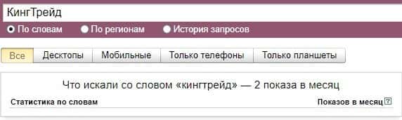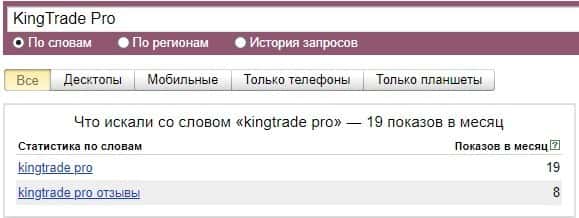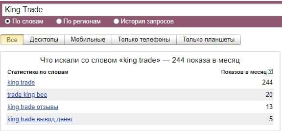 Также и ситуация и с брендом "King Trade", который также средне популярен по версии Яндекс.Вордстат и набрал 244 показов за месяц поэтому не следует обращать на них внимание.