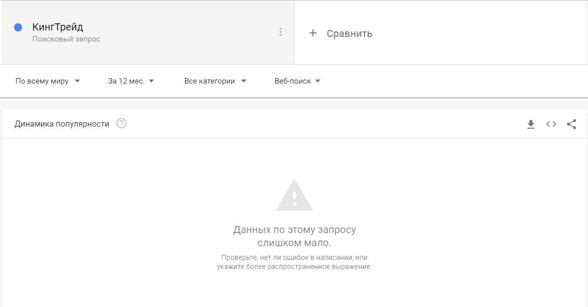 Если рассмотреть запрос бренда "Кинг Трейд" в Гугл Трендс, то здесь система не смогла определить количество запросов из-за их малого количества.