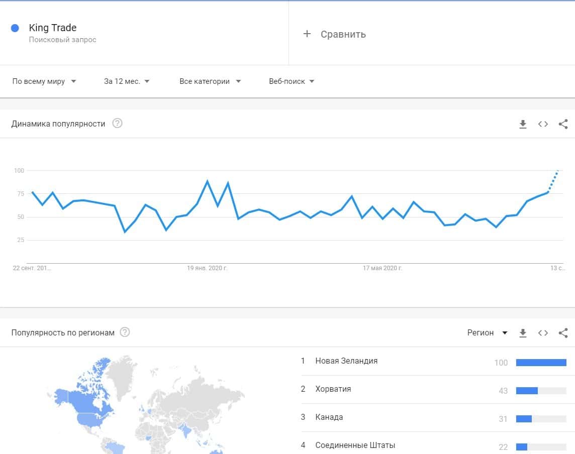А вот о запросе бренда "King Trade" есть также что сказать, так как они в Гугл набирают обороты по популярности. Показы в основном идут в Новая Зеландии, Хорватии, Канаде и США.