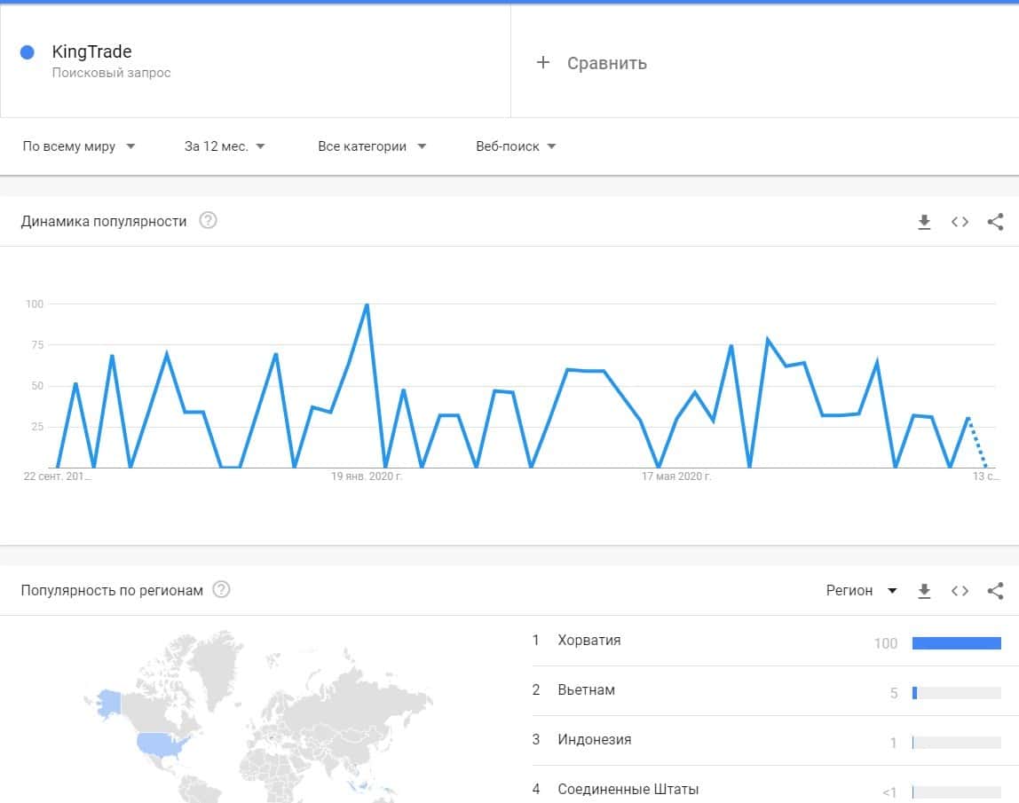 По бренду "KingTrade" статистика присутствует, но опять же Гугл Трендс выделяет данную контору как популярную и запросы имеются из Хорватии, Вьетнама, Индонезии и США.