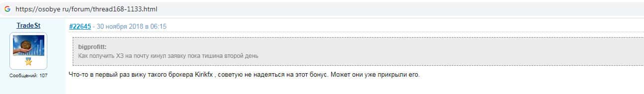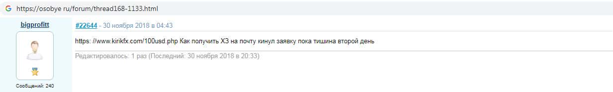 На веб-сервисе особие ру был замечен комментарий о скам-компании Кирик ФХ, а именно о том, что не стоит надеяться на начисление бонусных денежных средств на торговый счет, которые обещает псевдо-брокер каждому пользователю, который зарегистрируется. Не ведитесь на развод со стороны мошенников KirikFx !!!