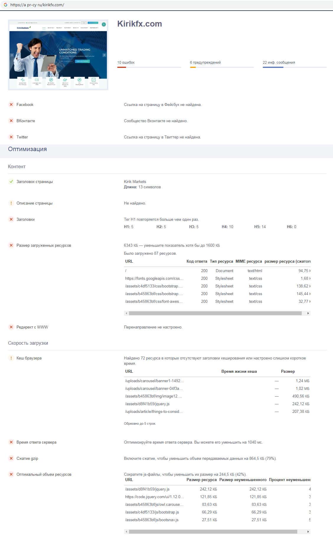 На интернет-сервисе a pr-cy ru была отыскана информация о скорости и производительности работы сайта скам-конторы KirikFx, на котором нет не одной ссылки на страницы в социальных сетях, а так же имеется множество неисправностей, из-за которых веб-ресурс очень сильно тормозит.