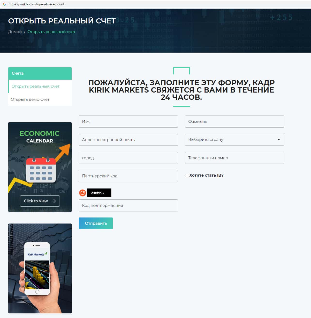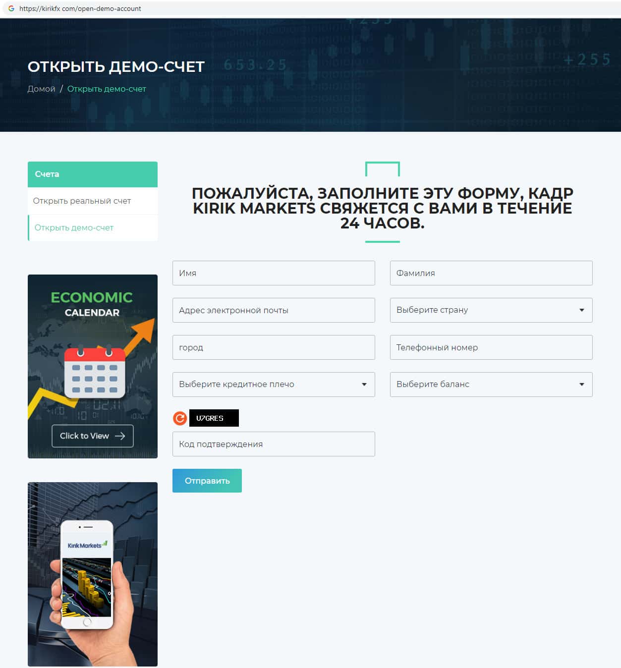 Скам-компания KirikFx на своем официальном сайте ведет сбор данных о клиенте и предоставляет бланк для регистрации на сайте, обещая после чего связаться с пользователем. Мошенники предлагают зарегистрироваться на демо-счете, но делают акцент на возможности торговли на их фальшивом сайте, открыв якобы реальный счет.