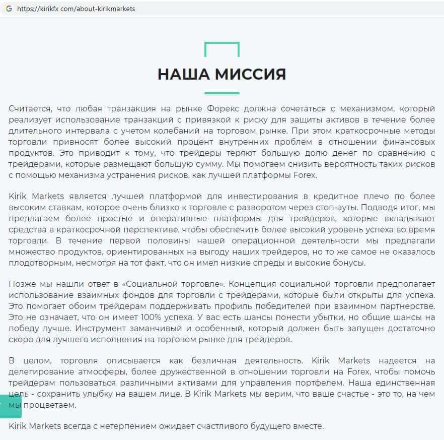 Шулера KirikFx врут людям о том, что их компании якобы можно доверять, чтобы привлечь как можно большее количество пользователей на свой сайт, рассказывая сказки о надежности их компании, сильно приукрашивая информацию о своей конторе. Это делается для того, чтобы втереться в доверие к людям и мотивировать к торговле на данном сайте.