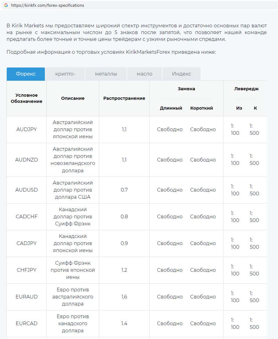 Здесь жулики KirikFx дают возможность пользователям сайта ознакомиться с перечнем финансовых инструментов, с которыми якобы специалисты будут совершать сделки и зарабатывать Вам деньги. Верить в такого рода сказки скам-компании Кирик Маркетс нельзя, поскольку похожая информация очень часто встречается на сайтах подобных скам-проектов.