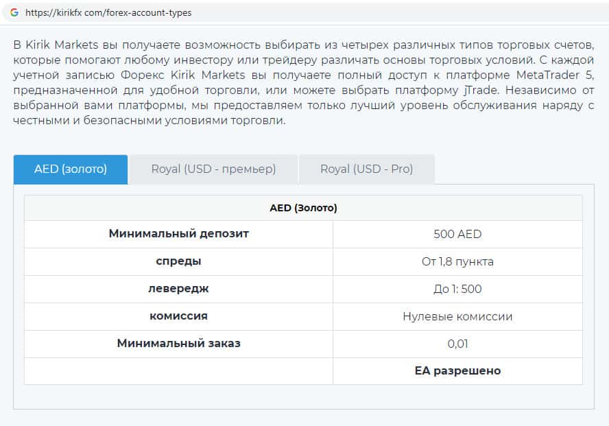 - Типы торговых счетов представленных на сайте скам-брокера Kirik Markets