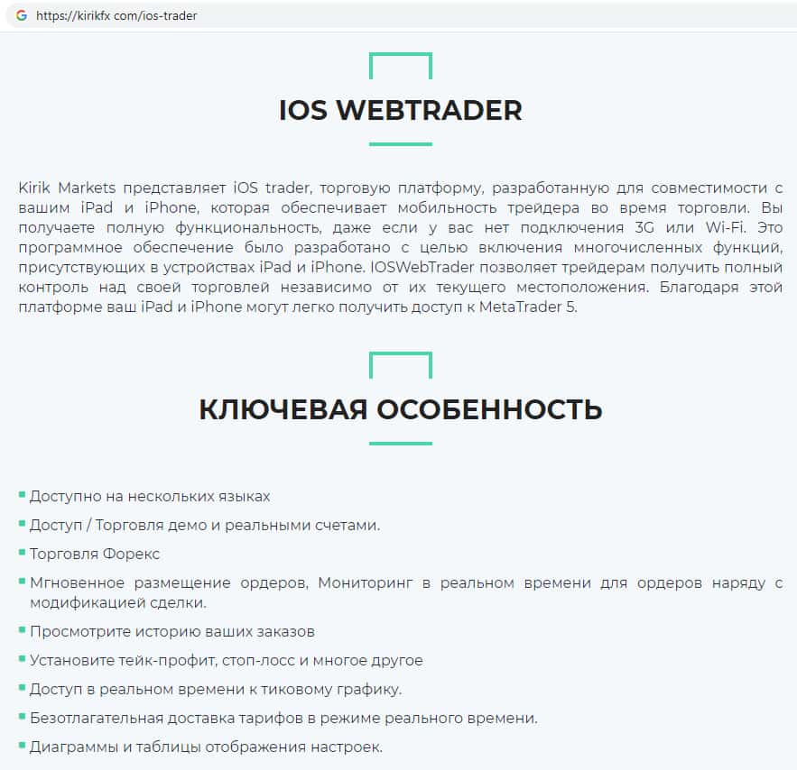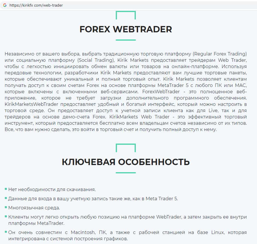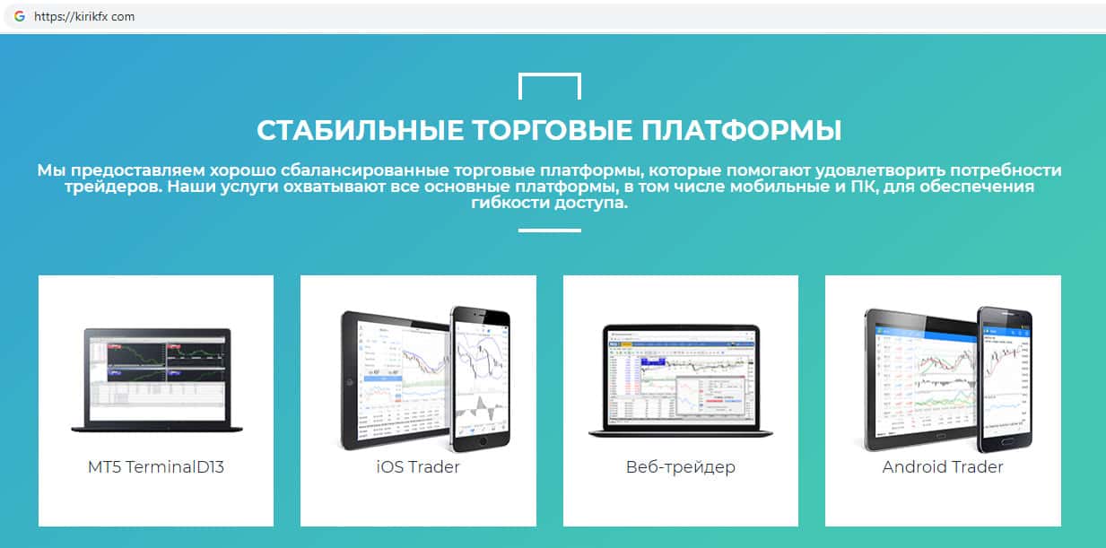 Шулера KirikFx предлагают стандартную ничем не отличающуюся от подобных мошеннических платформ, где очень легко слить все свои вложенные денежные средства, а именно: торговую платформу для торговли с помощью скачанного браузера, мобильного телефона или же скачанной программы для торговли.