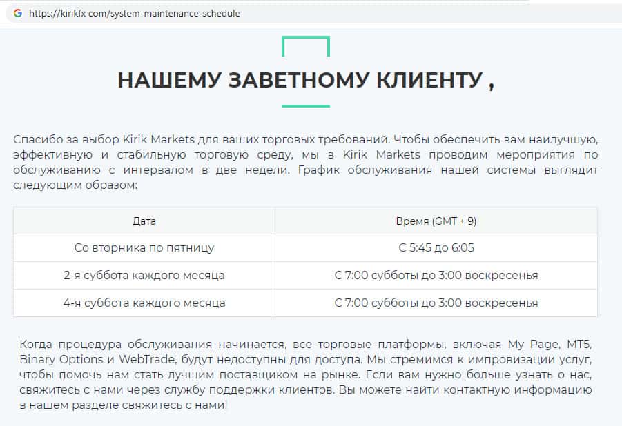 - Работа торговой платформы KirikFx ограничена во времени
