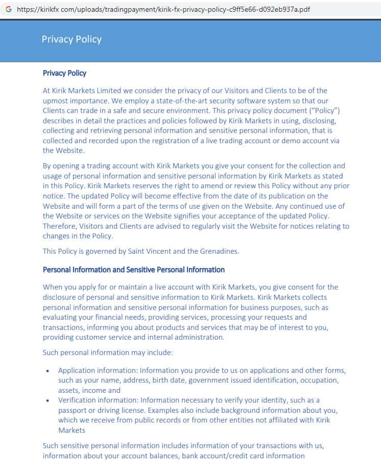 Политика конфиденциальности на веб-сайте скам-брокера Кирик ФХ