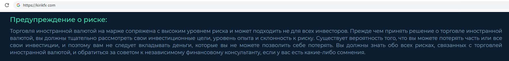 В уведомлении о рисках мошенническая организация Кирик ФХ указывает о том, что торговля на сайте сопряжена определенным уровнем риска. Соответственно данная брокерская компания не несет никакой ответственности за деньги утраченные клиентом на их фальшивом сайте. В данном случае шулера ссылаются на ошибочный выбор торговой стратегии клиента.