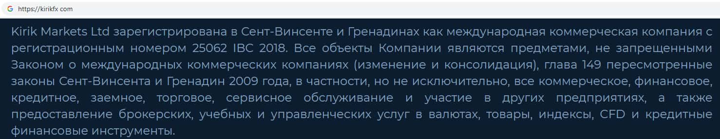Данный интернет-лохотрон под названием Кирик ФХ принадлежит юридическому лицу, находящемуся в одном из оффшоров на острове Сент-Винсент и Гренадины, где зарегистрировано немалое количество подобных мошеннических организаций. Это не дает право предоставлять свои брокерские услуги на территории Российской Федерации.