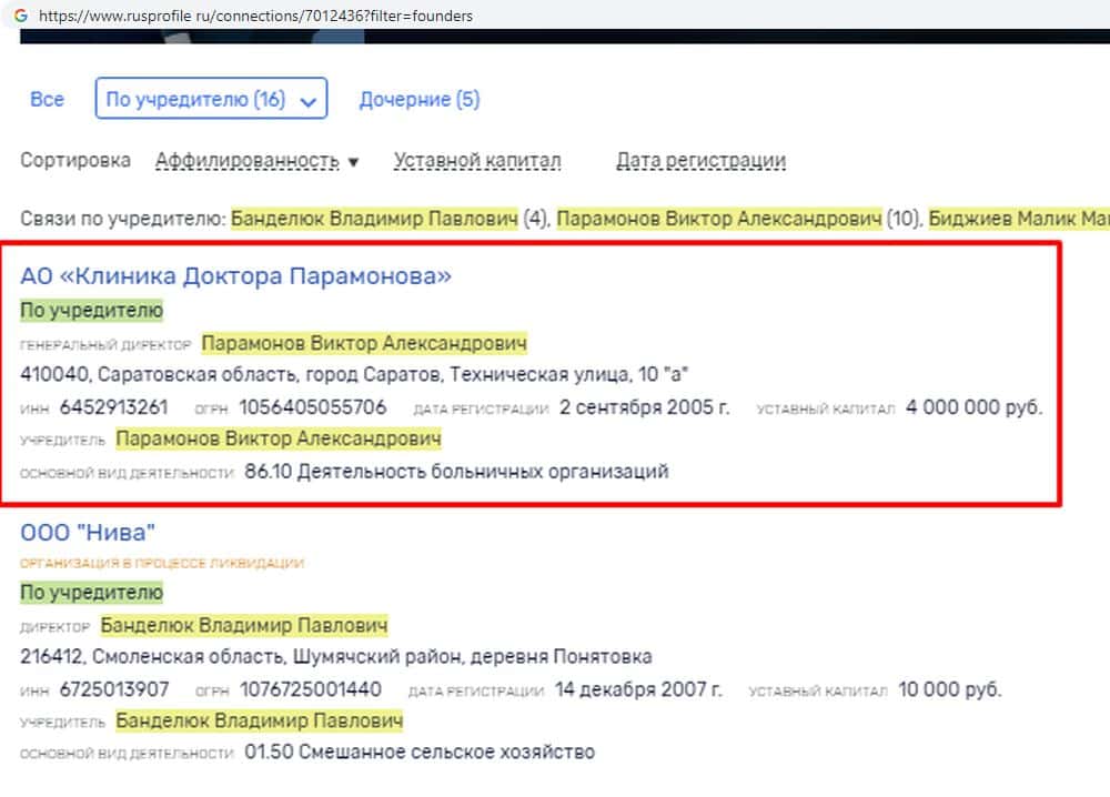 Как известно, сомнительная организация Клиника Доктора Парамонова связана с лохотроном Казна Ра и, вероятно, ею управляют те же владельца. Но их настоящие имена выяснить сложно, известно только, что к масштабной афере причастен всепланетарный казначей Александр Парамонов. Официальные учредители недоклиники: